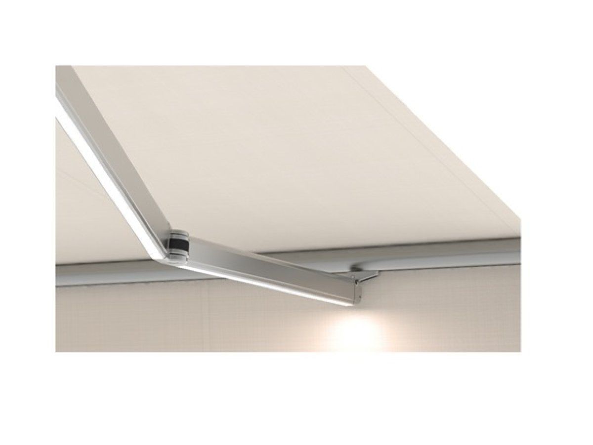 LED-Beleuchtung: Warmweißes Stimmungslicht leuchtet direkt auf den Platz unter der Markise. Die hochwertigen LED-Bänder sind dimmbar, langlebig, stromsparend und mit einer opalweißen Kunststoffleiste abgedeckt. Die Bedienung kann per Funk-Wandschalter oder Funkfernbedienung gesteuert werden. Die Kabel liegen in den Armen und im Tragrohr der Markise.