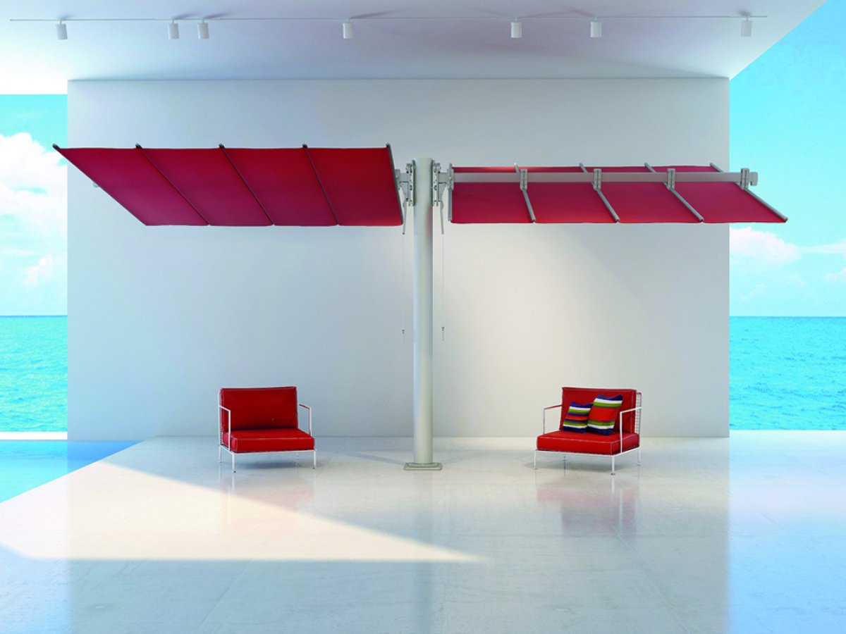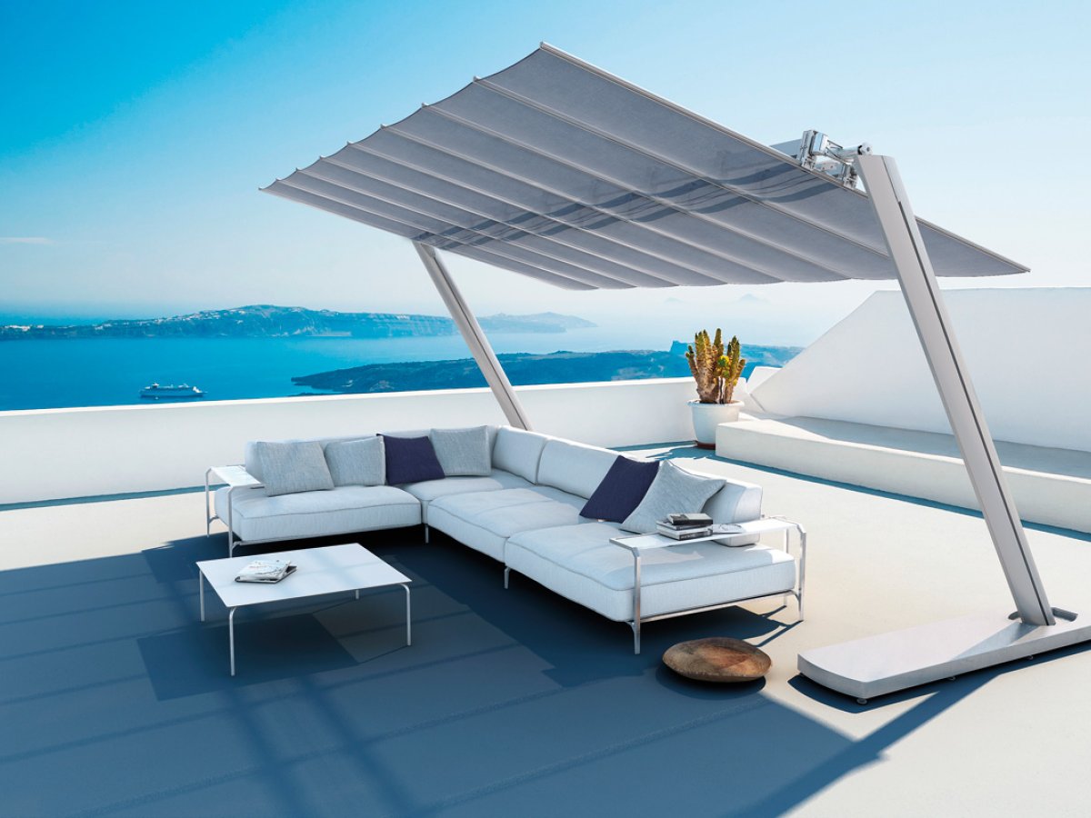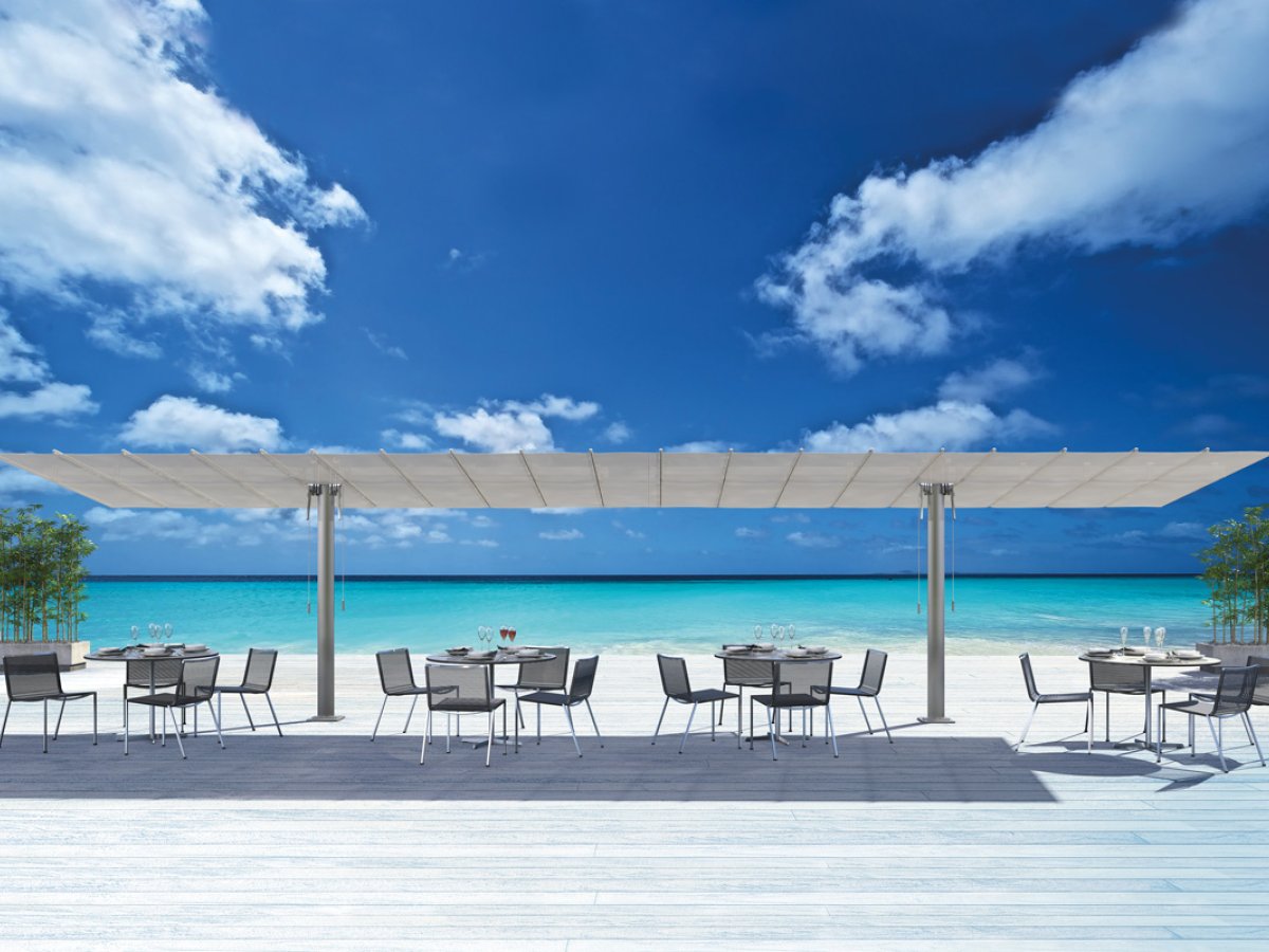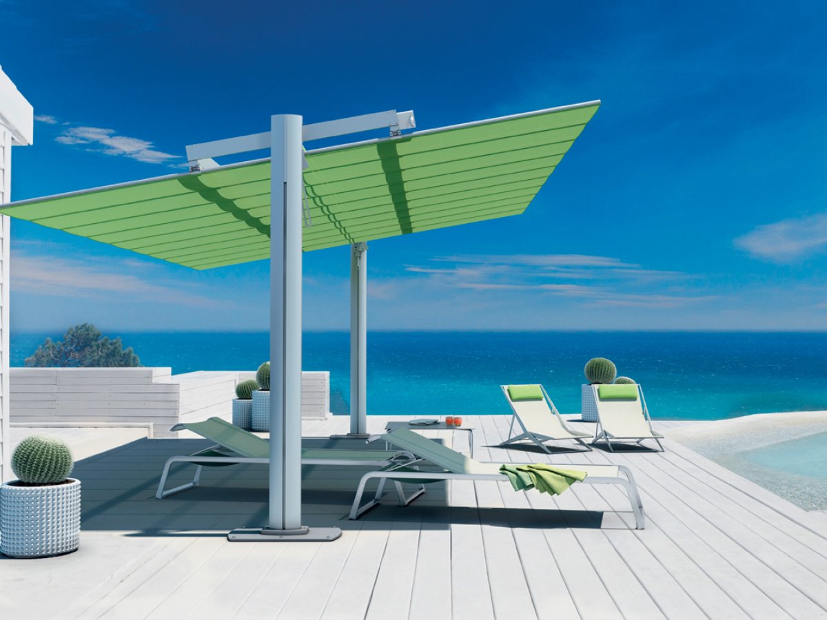 Die Segelmarkise Flexy mit einem modernen, minimalistischen Design, das große Flächen abdecken kann. Die geneigten elliptischen Masten charakterisieren das einzigartige Design des Produktes. In verschiedenen Größen, die miteinander kombiniert werden können um große Flächen zu beschatten. Ideal für den Objektbereich und Privatgebrauch. Die Markise ist leicht bedienbar und das Segel kann zusätzlich waagrecht gekippt werden.