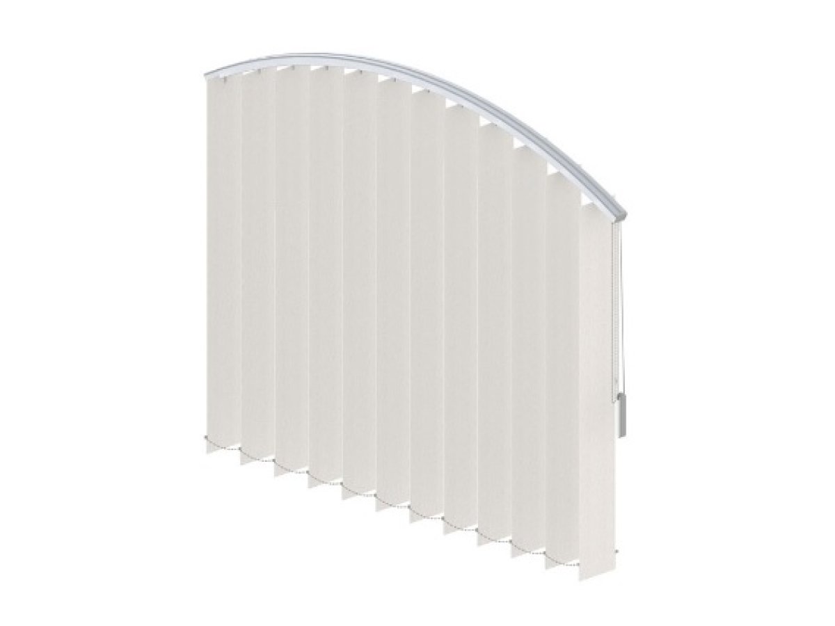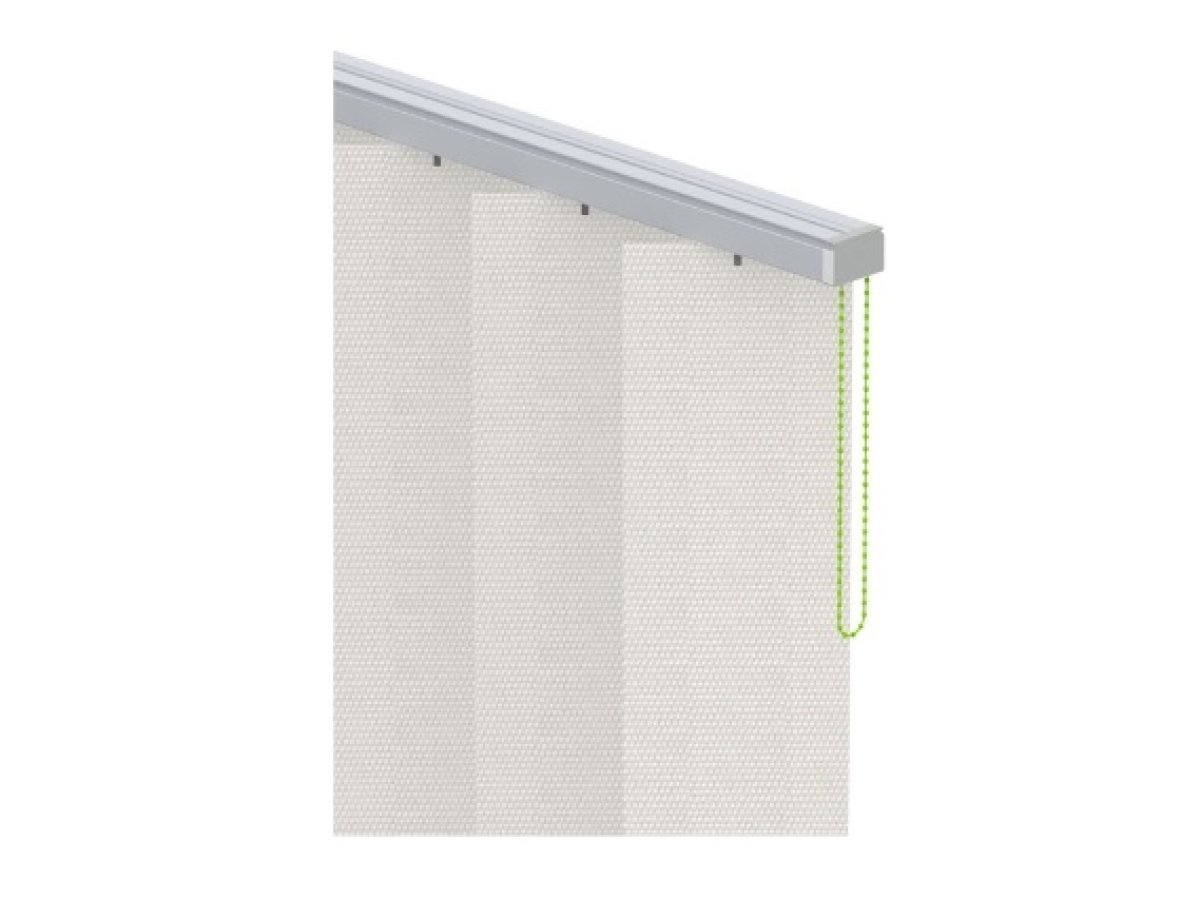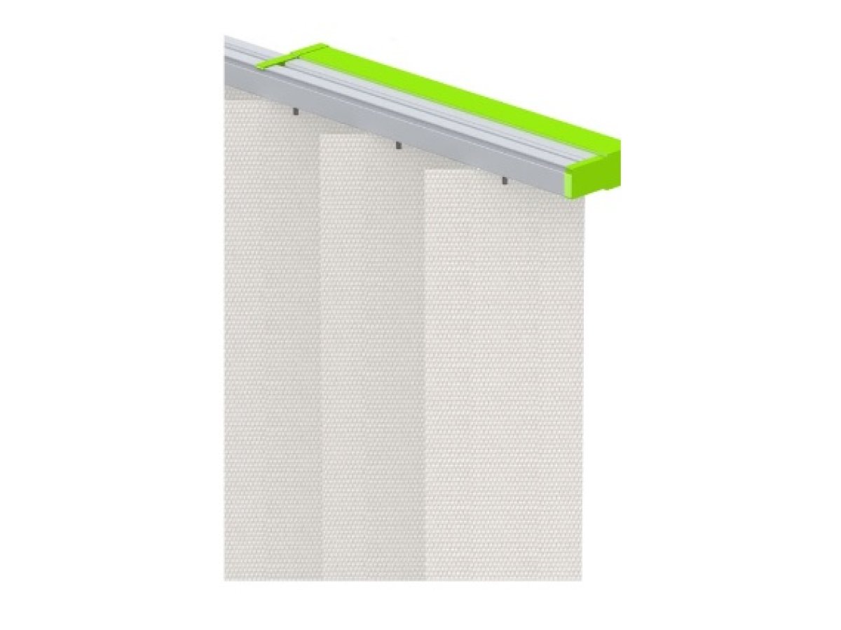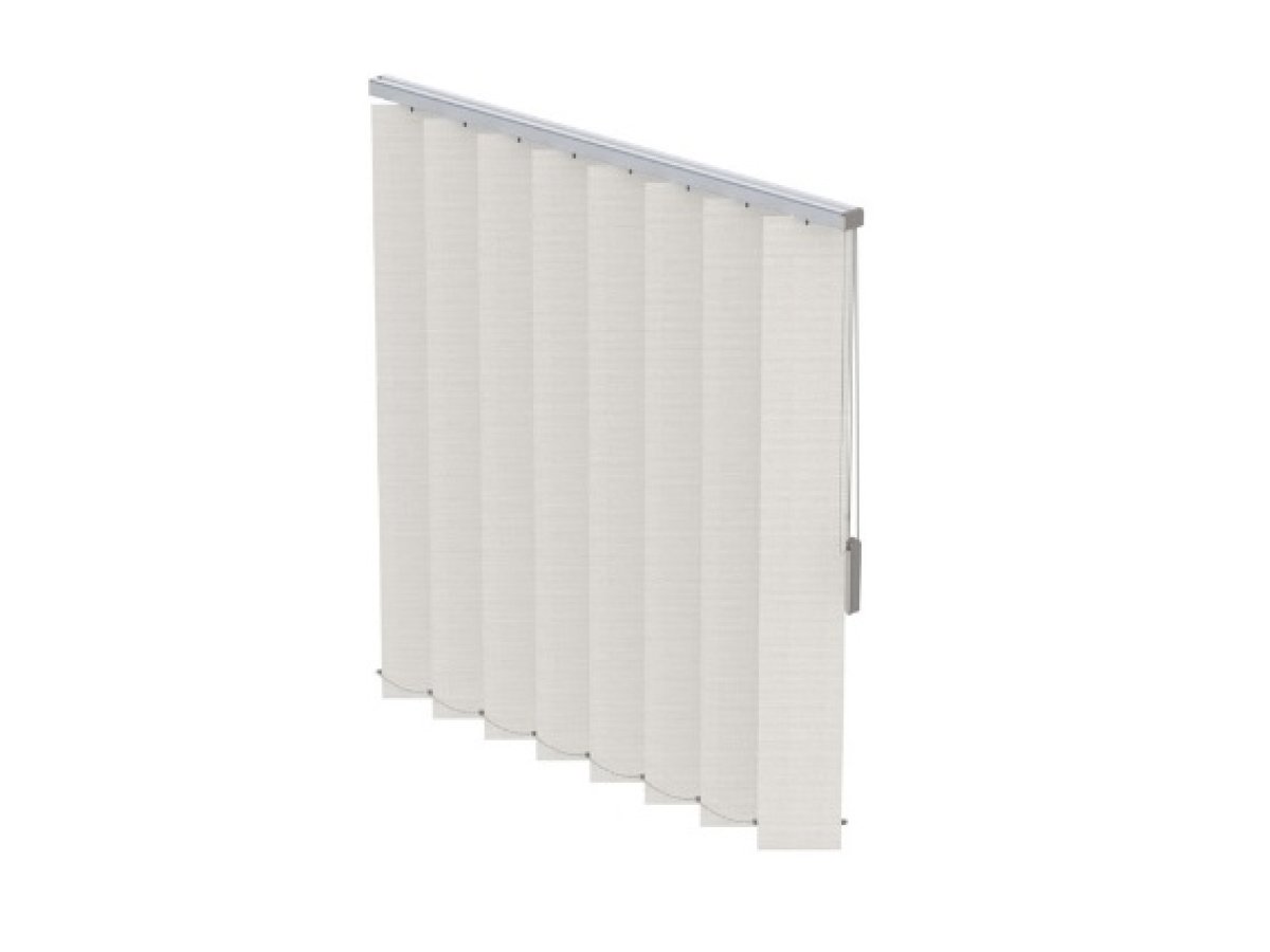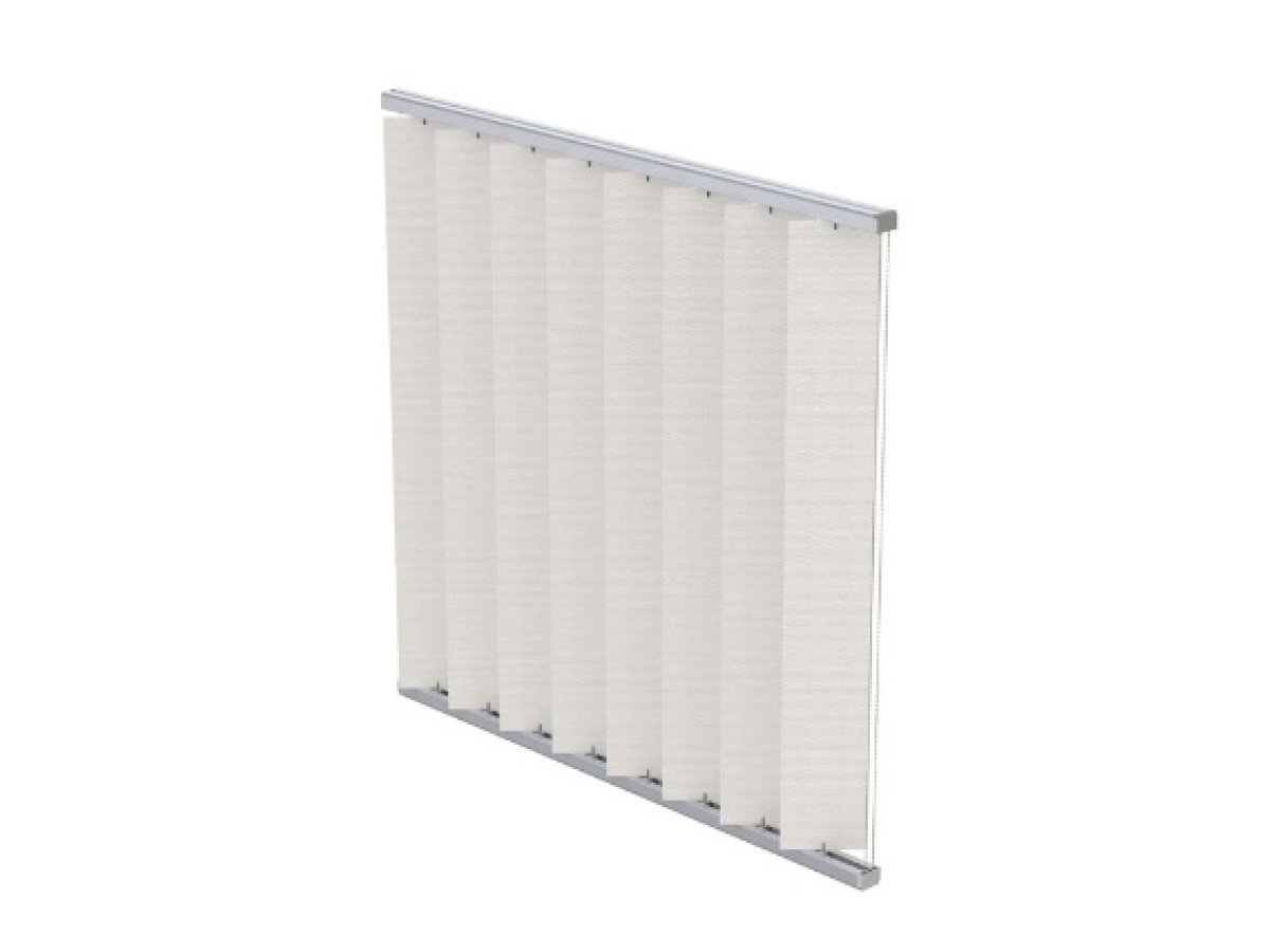 Senkrechte Vertikaljalousie mit zwei Führungsschienen oben und unten.